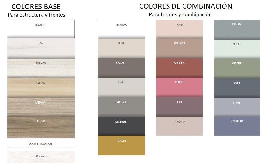- Tableros de 19 mm postformados: puertas y cajones, excepto puertas curvas.